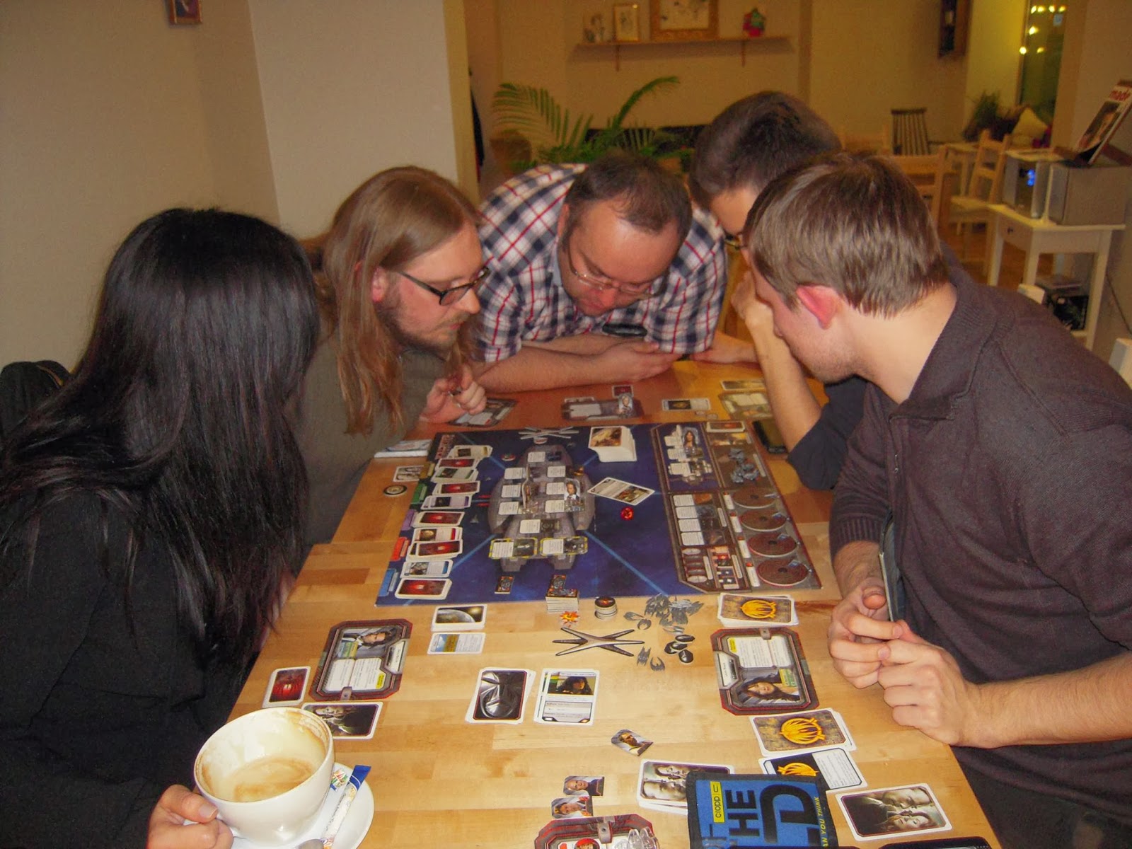 Autorem zdjęć jest Joanna Adaśko, nasz szanowny organizator grupy. Spotkanie zdominował "Battlestar Galactica", aby tuż po przegranej ludzi [Sławek i Krzysztof przeszli na stronę blaszaków] rozpocząć kolejną partię w "Avalon". Partii było łącznie trzy, ale w żadnej z nich nie wygrali Ci dobrzy. Zresztą liczba pomyłek jakie popełniła przejdzie do legendy - z czego na czele stoi Merlin, który nie wypatrzył złych [!] :)